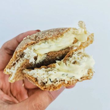 5pcs per pack. Almond Pandesal filled with garlicky herbed cream cheese.